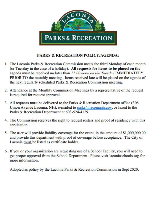 The user must provide liability coverage for the event, in the amount of $1,000,000.00 and provide this department with proof of coverage before acceptance. The City of Laconia must be listed as certificate holder.